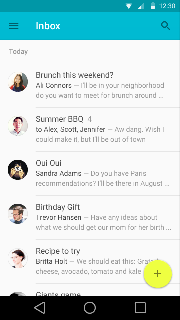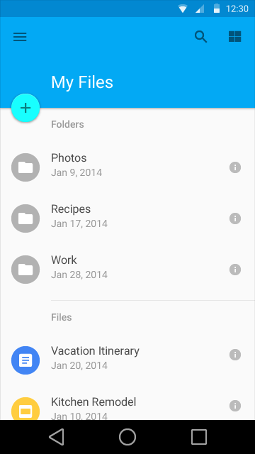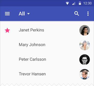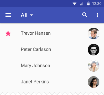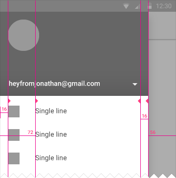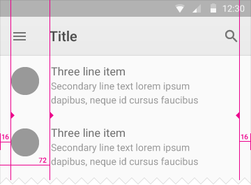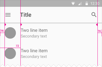 在清單的頂部和底部會(自動)增加 8 dp 的內距。唯一的例外是在清單頂部使用子標題,因為子標題已經有他們自己的內距了。