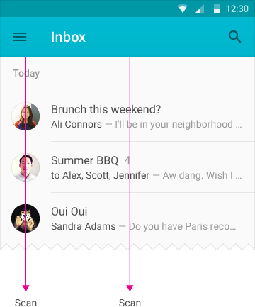 主要動作與輔助動作,例如:播放、放大、刪除和選擇,因為會被立即執行,所以一般並不會再顯示一個包含數個選項的子選單 (溢出清單的動作)。
