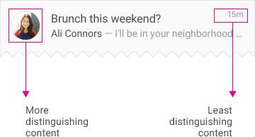 一個清單中的每個磁磚,可將具有關聯性的內容群組,以統一的格式呈現,並且透過提高同類型內容或者同群組內容的重要性,利用階層,加強內容可讀性。例如:將大頭照和文字描述的重要性,設定的比時間戳記高。這麼做可以幫助使用者更容易找到一個內容群組中的顯著資訊。